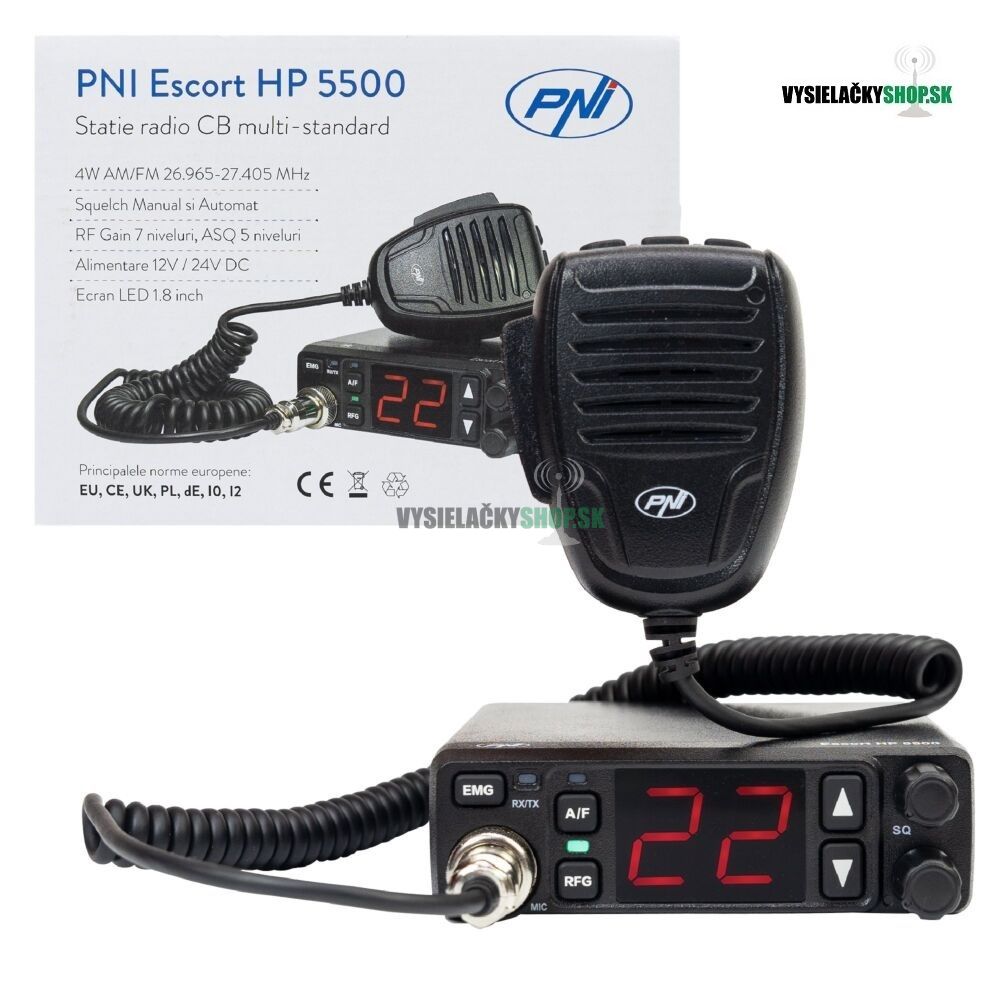 Ďalšie vlastnosti stanice PNI Escort HP 5500 : emisný výkon 4 W, napájanie 12 – 24 V, 40 kanálov, modulácia AM/FM, núdzové kanály 9 – 19, 6-pinový konektor pre mikrofón, prídavný konektor pre externý reproduktor.