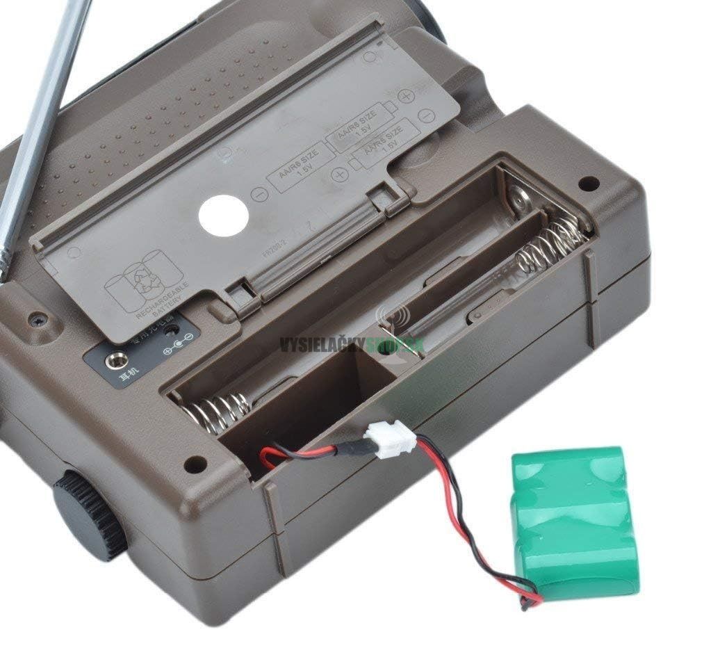 Rádio môže byť napájané batériami 3xAA alebo nabíjané aj kľukou alebo cez DC vstup pribaleným USB káblom.